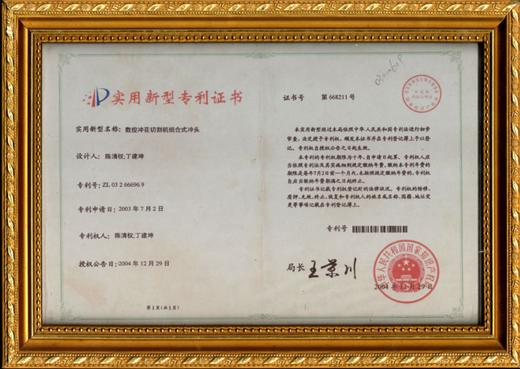 公司产品数控冲花切割机组合式冲头取得实用新型专利证书